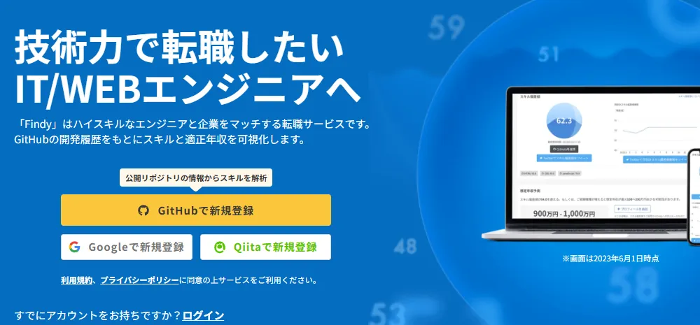FindyはGitHubを連携して利用する転職サービスであり、開発言語ごとの偏差値を自動で導き出してくれます。