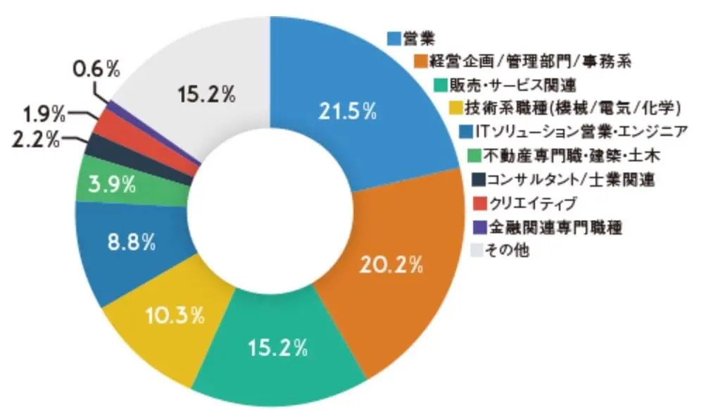 また、登録している求職者の経験職種は、「営業」「経営企画・管理部門・事務系」「販売・サービス関連」が半数以上を占めていることから、これらの職種経験を活かせる求人を多数保有していると言えるでしょう。