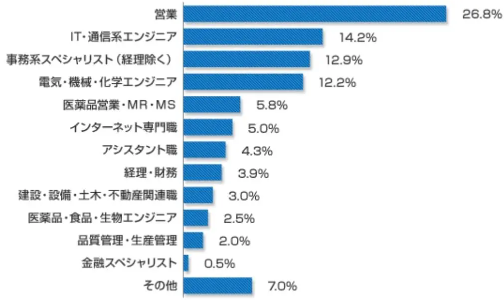 リクルートエージェント転職決定者のおよそ4割が営業、IT・通信系エンジニアへ転職を成功させています。